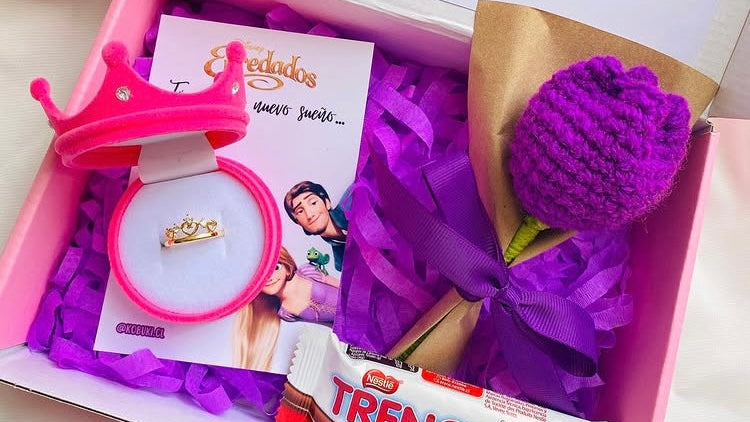 Hermosa box, ideal para regalar a las fans de RAPUNZEL incluye un bello anillo en baño oro 18k con incrustaciones de cristales, lo mejor de este modelo es que es ajustable, puedes llevarlo solito con la cajita o con el full box que incluye un tulipán tejido a crochet + un chocolate.