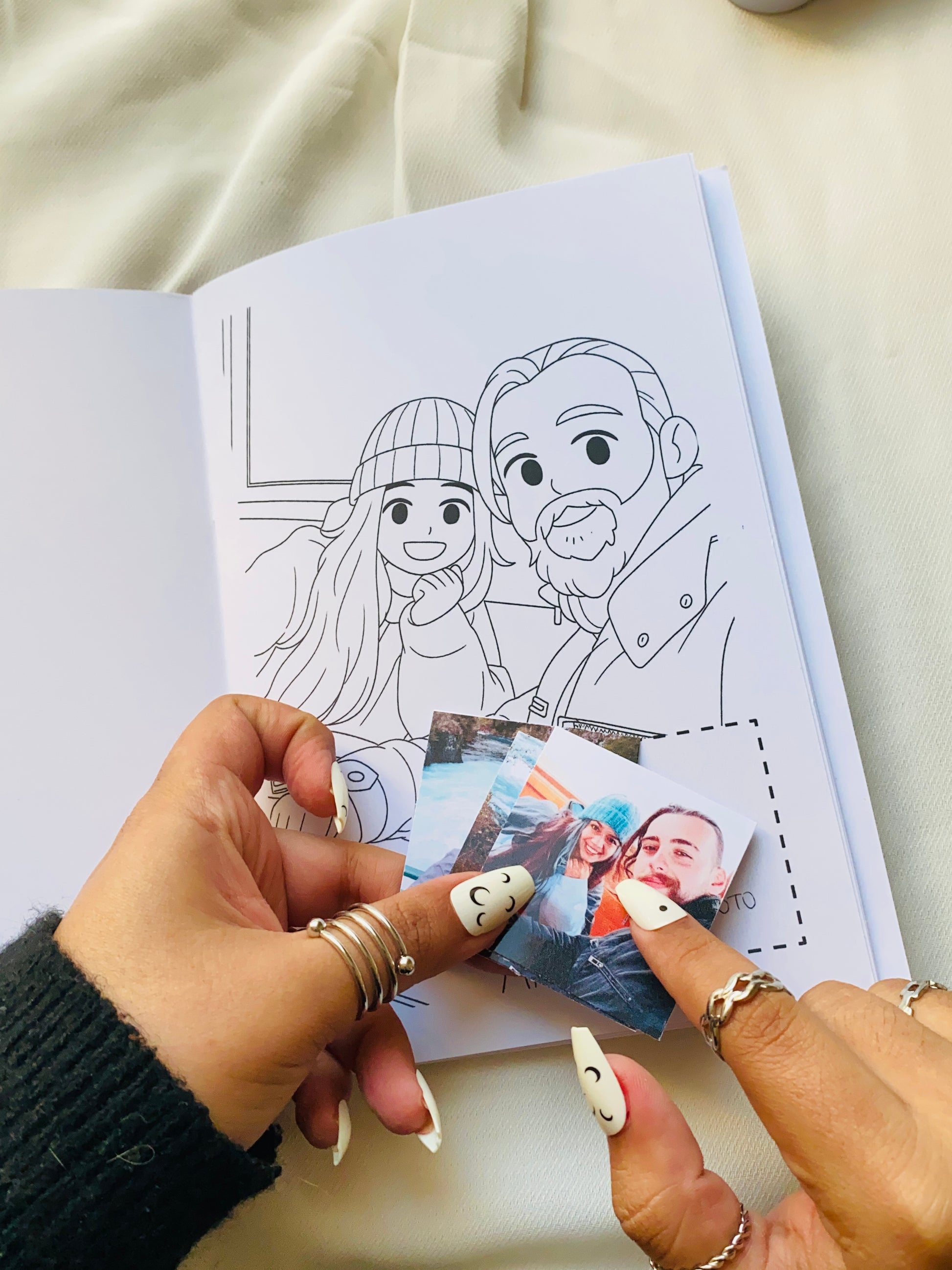 Un libro único y hecho especialmente para ti. Incluye 10 caricaturas personalizadas basadas en tus fotos, listas para que las pintes a tu estilo.